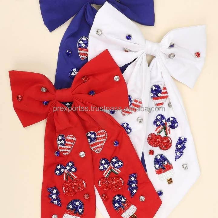 USA Patriotic Girls Hair Bow Beaded Cheer Clip Red White Blue Fireworks Festival Parade Accessory Satin Wedding Parties