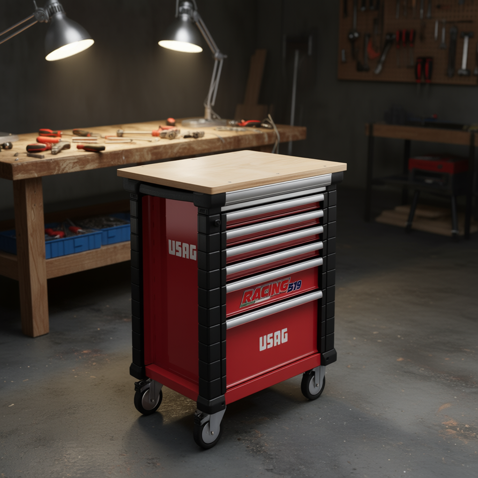 USAG Racing 519 Tool Cabinet With Wooden Top And Wheels For Workshop Storage