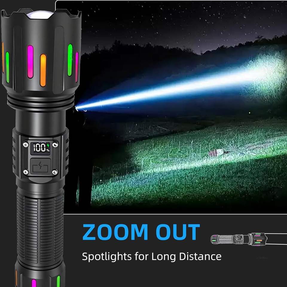 USB C Flashlights High Lumens Rechargeable Super Bright 1500 Meters Long Beam LEP Tactical Flashlight With Luminous Strips