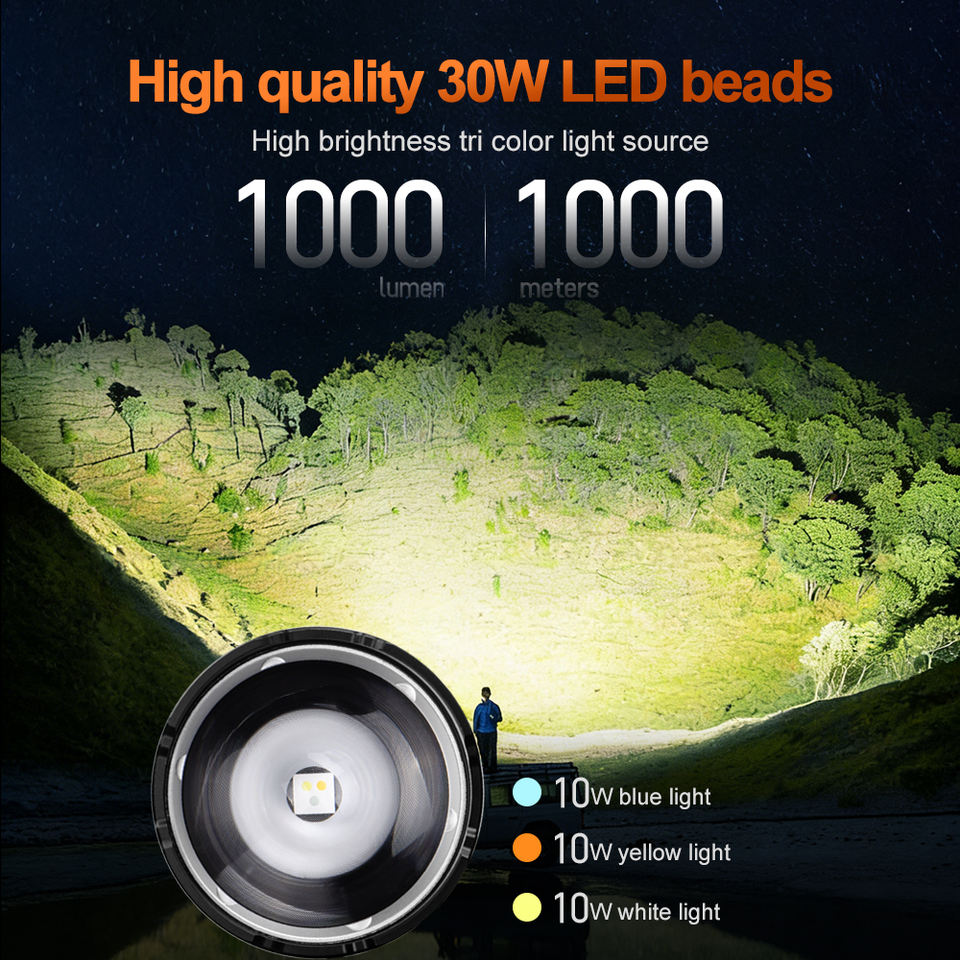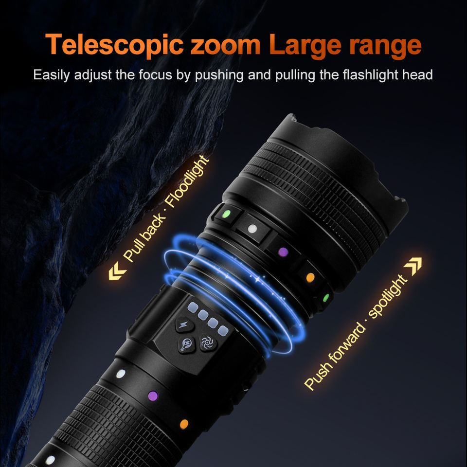 USB Output LED Flashlight High Power 1000M Long Range Zoomable Retractable Rechargeable IP65 Waterproof 3000+ Lumens Aluminum