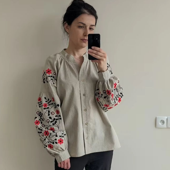 Ukrainian Vyshyvanka Natural Linen Blouse Washable Vintage Style with Black Red Floral Embroidery Ethnic Puff Sleeves