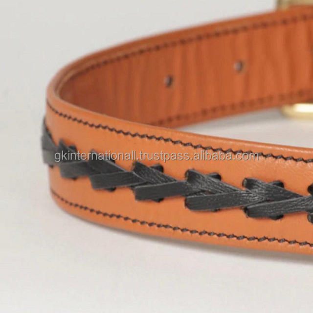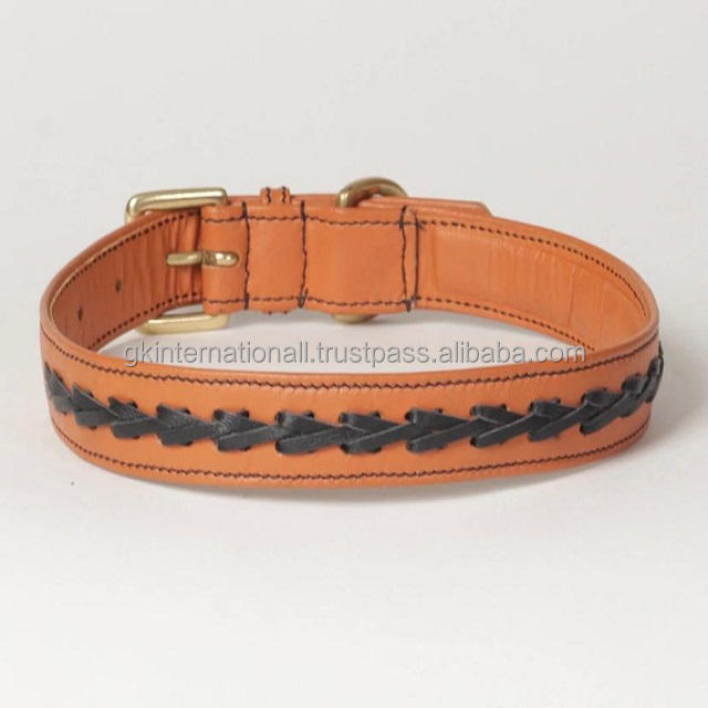 Ultra Soft & Supple Tan Finish Genuine Leather Dog Collar With Black Napa Hand Braided and Contrast Edge Stitching Pet Collar