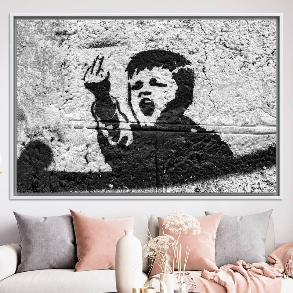 Unique Banksy Inspired Boy Glass Print Canvas Artwork for Room Decor,WHITE FRAMED CANVAS
