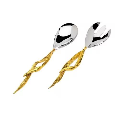 Unique Design Eco-Friendly Stainless Steel PVD Silver Mirror Polished Gold Handle Salad Server Set Dishwasher Safe Flatware