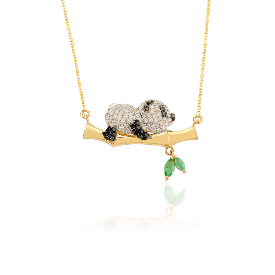 Unique Design Emerald & White Black Diamond Sleeping Panda With Bamboo Pendant Necklace Cute Animal Jewelry 18K Yellow Gold