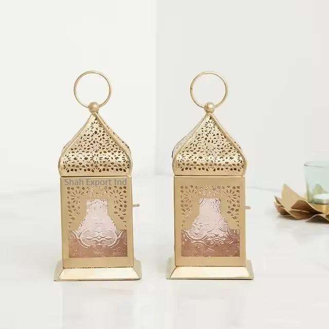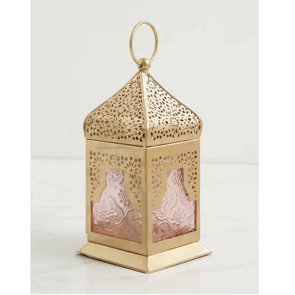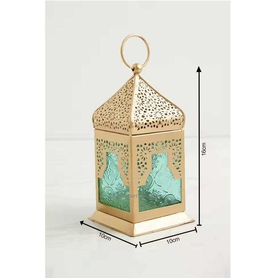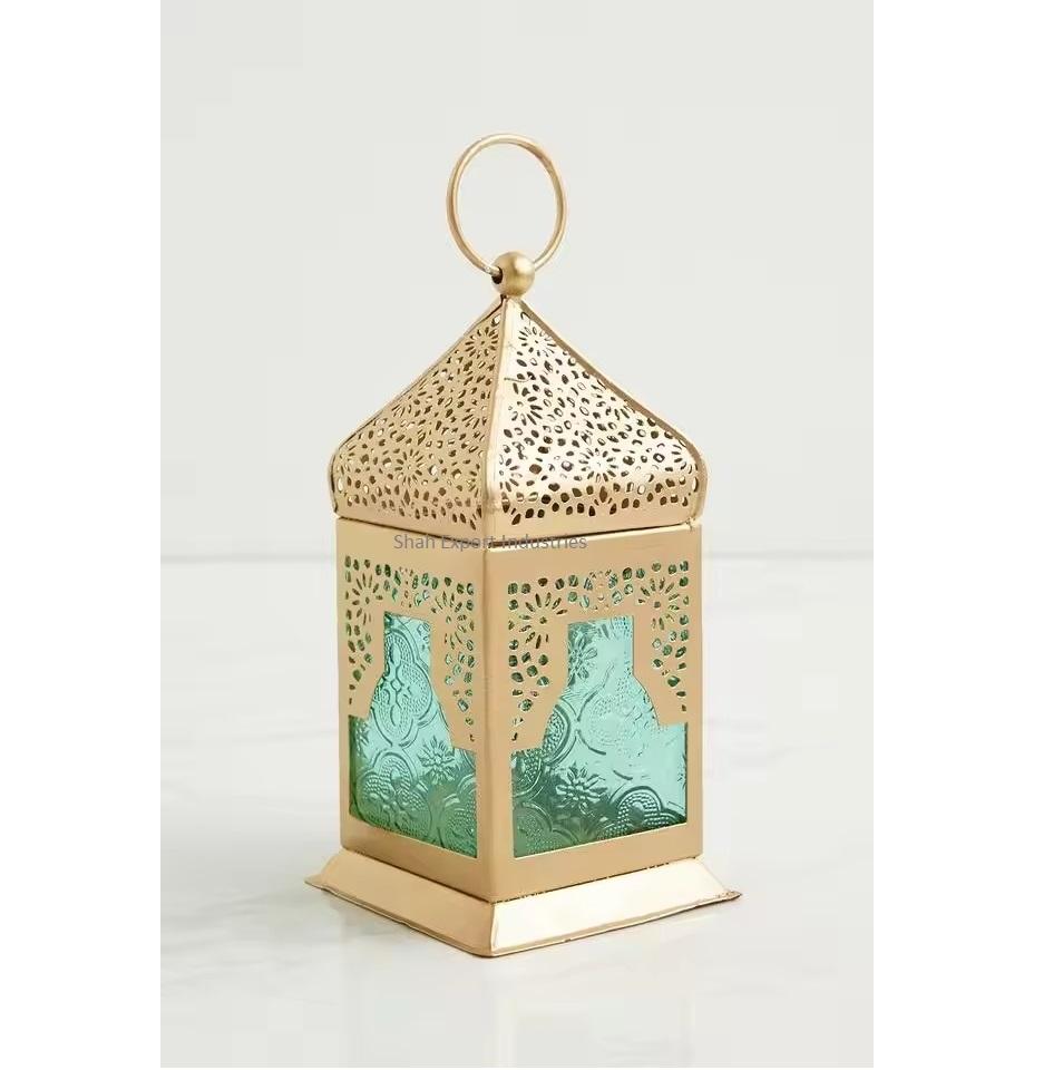 Unique Design Handmade Eco-Friendly Metal/Brass Gold Customized Color Mini Hanging Moroccan Lantern Teal Glass Home Garden