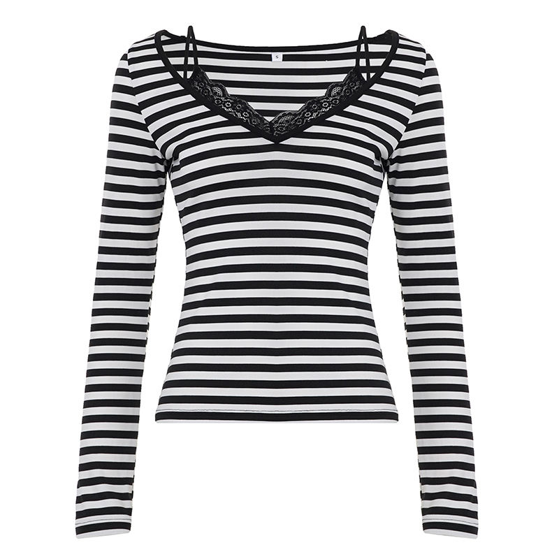 Unique False Two Piece V-Neck Top Women's Casual Striped Color Block Lace Breathable Compressed Long Sleeve Knit T-Shirt