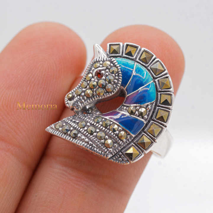 Unique Horse Shaped Natural Marcasite Gemstone Ring 925 Sterling Silver Enamel Ring Unicorn Ring for Christmas