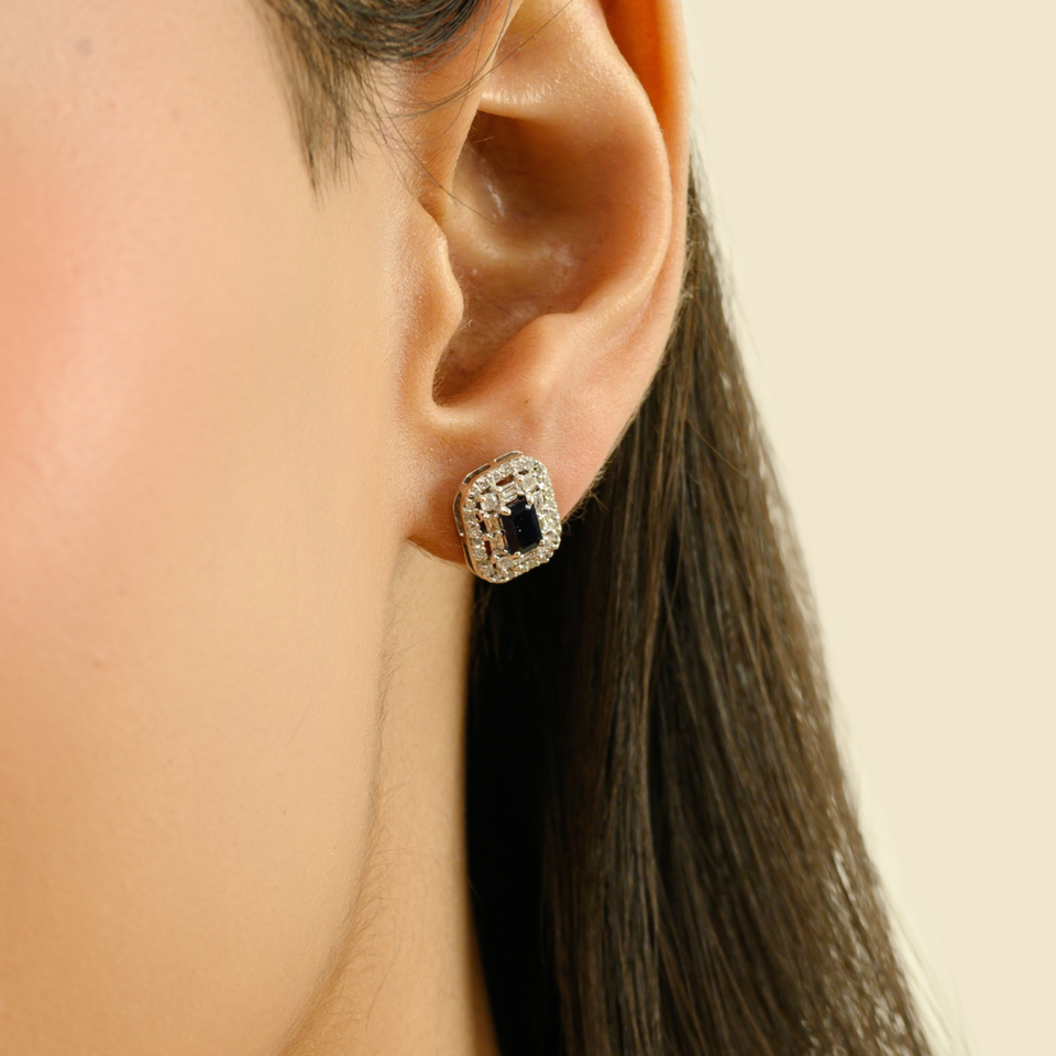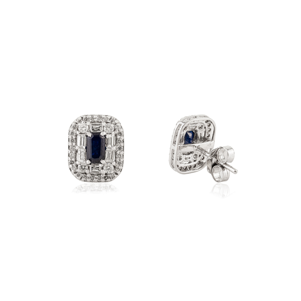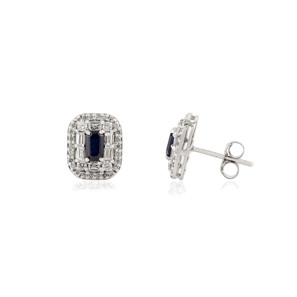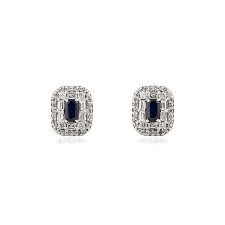 Unique Trending Design Luxury Blue Sapphire & Diamond Women Double Cluster Stud Earrings 14K Solid White Gold Statement Jewelry