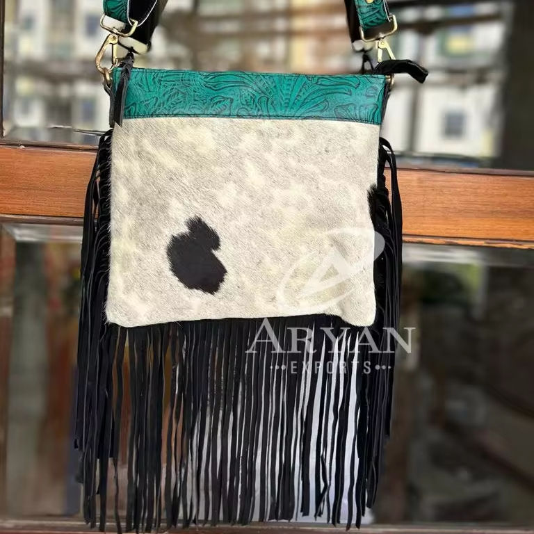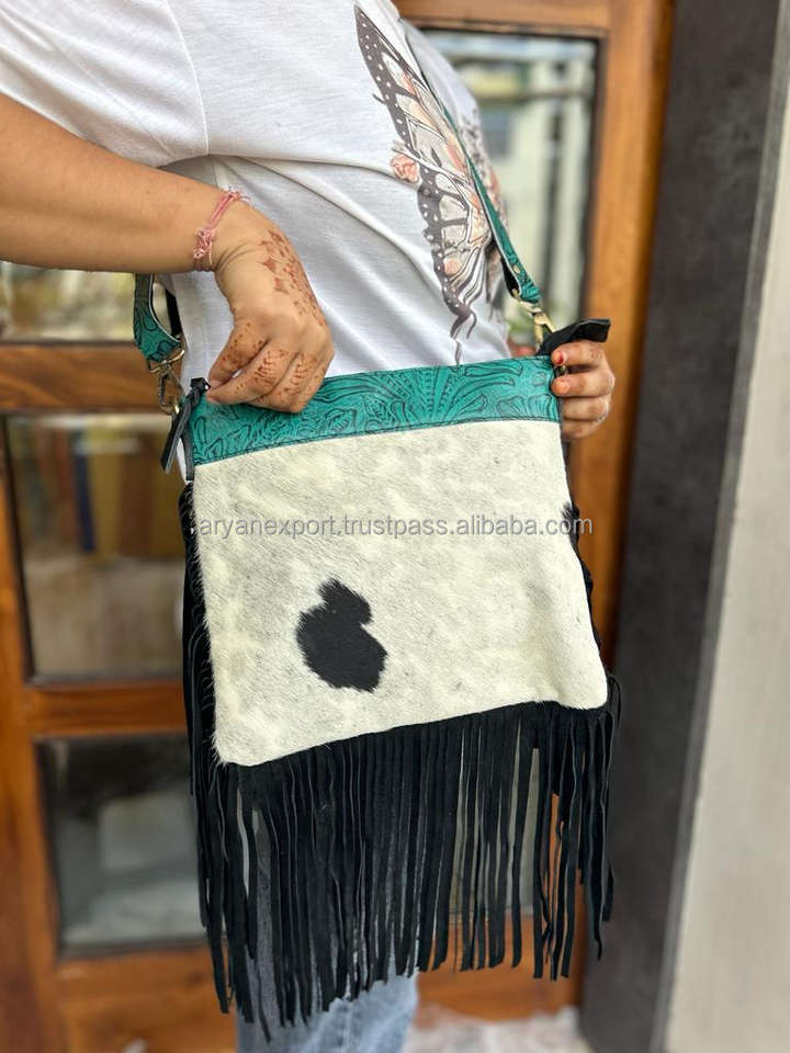 Unique Western Style Tooled Cowhide Fur Leather Fringe Sling Bags Women Embossed Color Print Fur Leather Vintage Crossbody Bags
