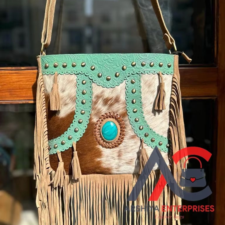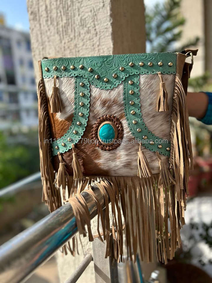Unique Western Style Tooled Hair on Hide Fur Leather Sling Bag Women Embossed Colour Tooled Fur Leather Vintage Style Side Bag
