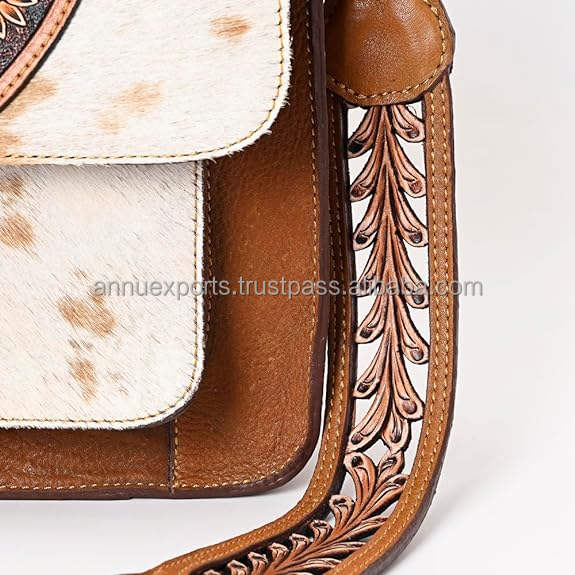 Unique Western Style Tooled Hair on Hide Fur Leather Hand Bag Women Handmade Tooled Fur Leather Vintage Style Messenger Bag