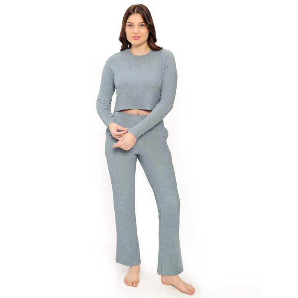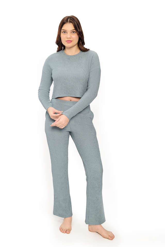 Unique Women Elegant Jacquard Two Piece Co Ord Set with Knitted Crop Top & Flare Trousers Stylish Casual Outfit for Bulk Orders