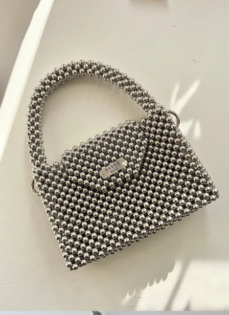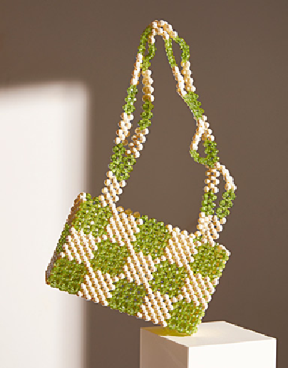 Unique artistic beaded mini tote bag featuring a beautiful embroidered-look countryside landscape scene, at wholesale prices.