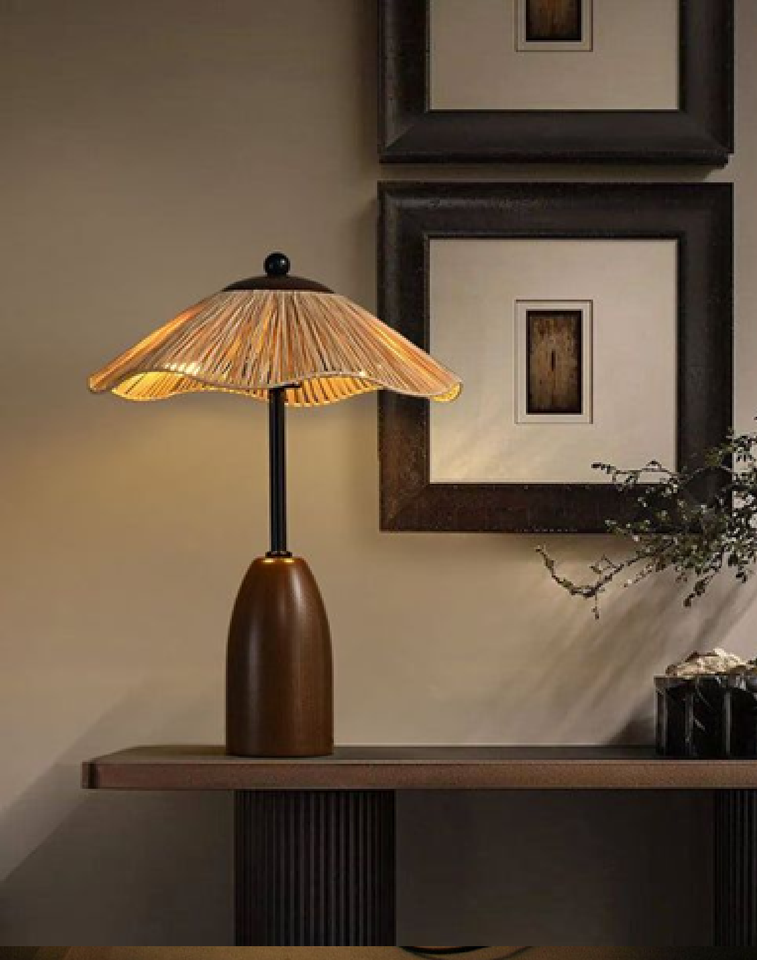 Unique lamp with pleated wooden slats on the shade and base. Available at wholesale prices