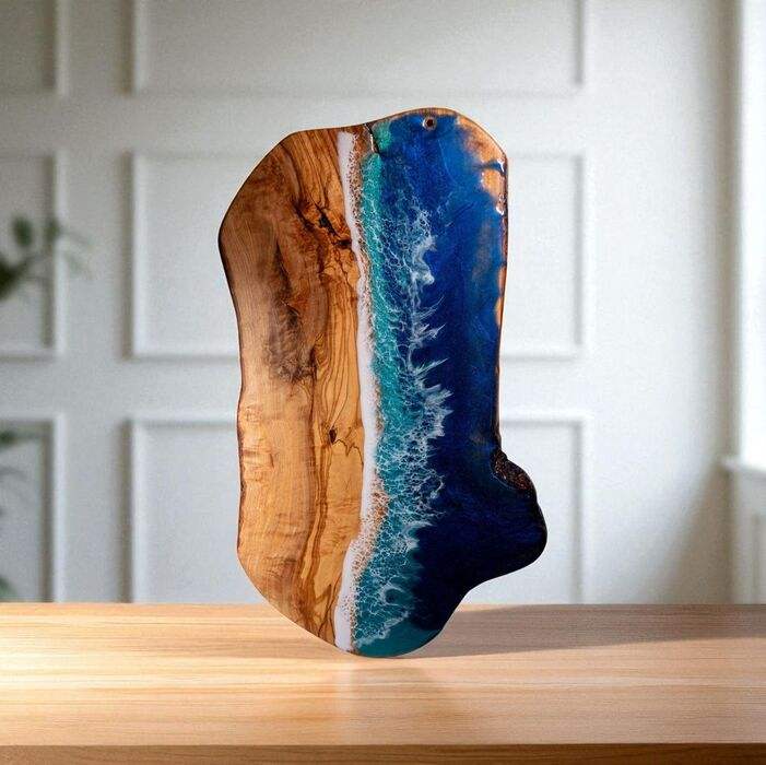 Unique resin chopping board featuring turquoise epoxy art made with acacia wood base ideal for sushi or fruit presentation