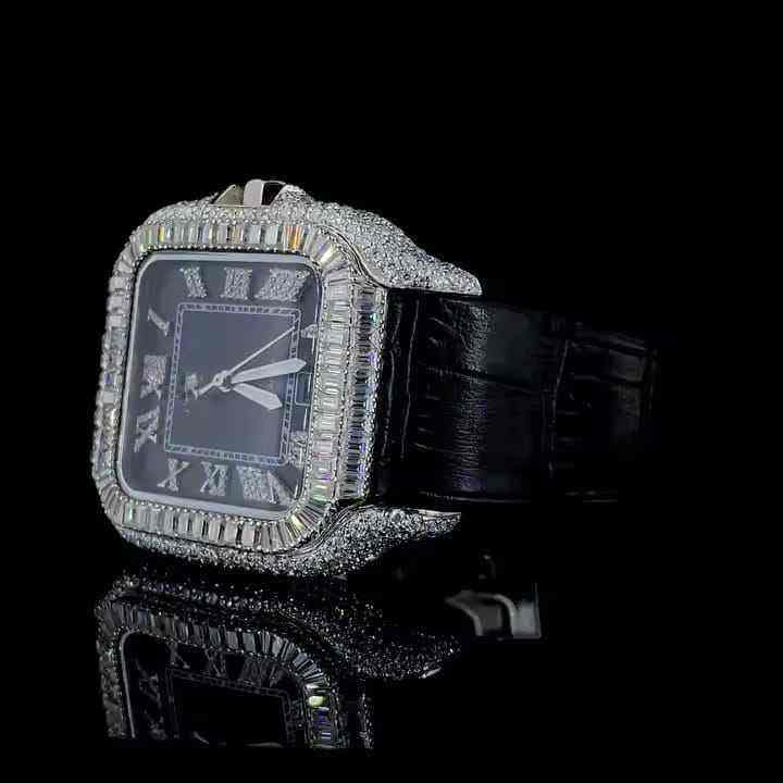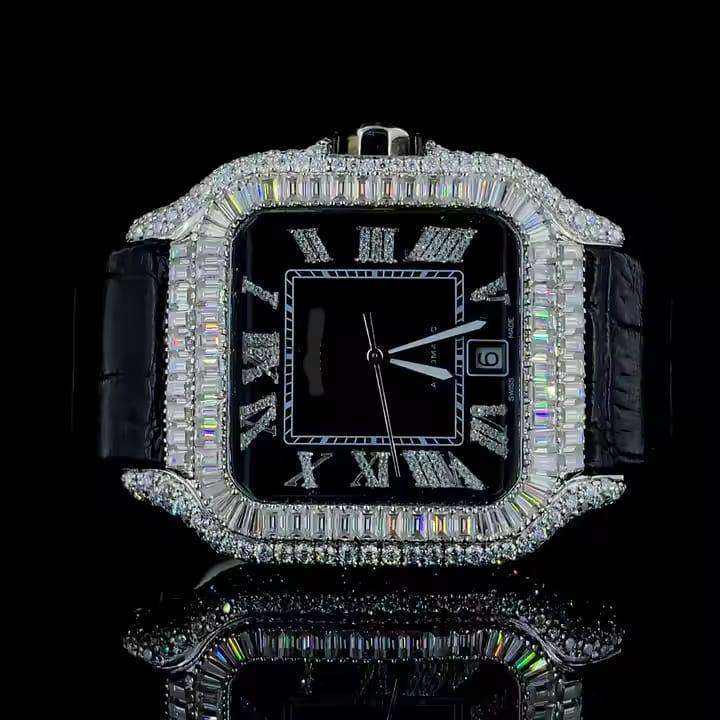 Uniquely Crafted Fully Customized Baguette Moissanite Diamond Watch VVS Clarity Roman Glass Stainless Steel 20mm Band Width