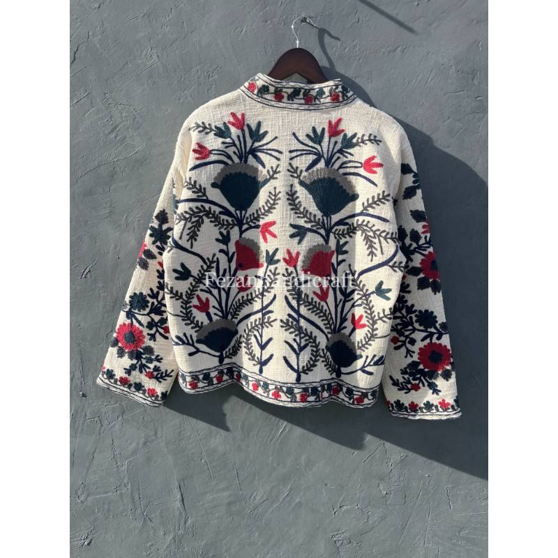 Unisex Autumn Winter Short Coat Cotton Velvet Suzani Jacket with Floral Uzbek Embroidery Knitted for Women Side Lining Parties