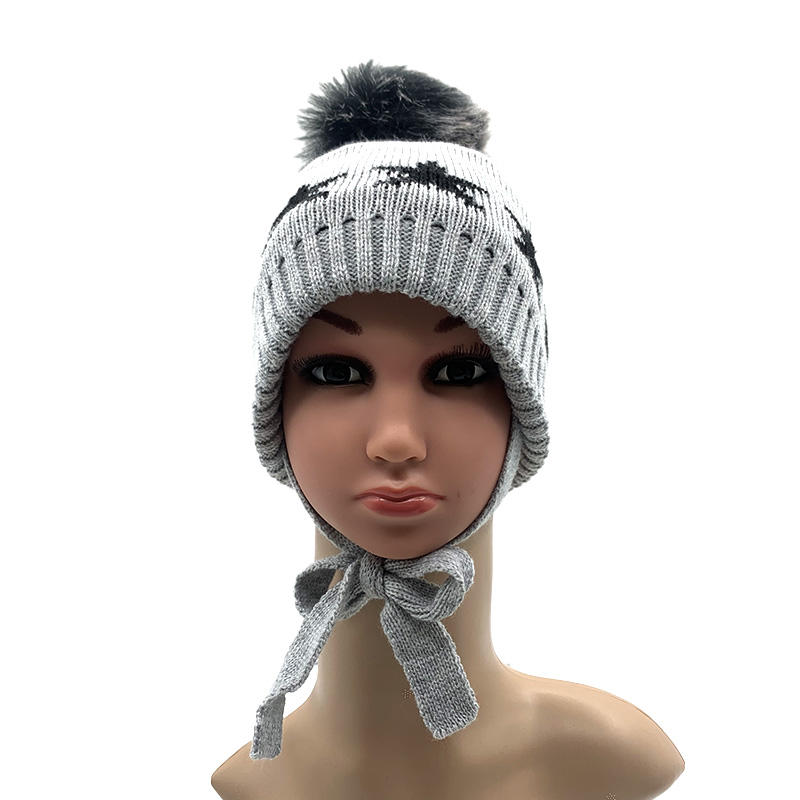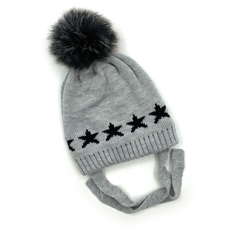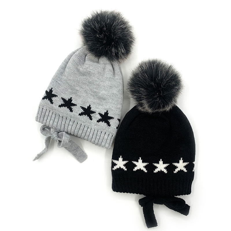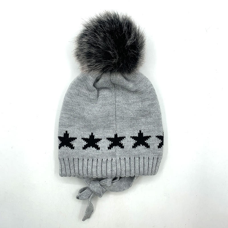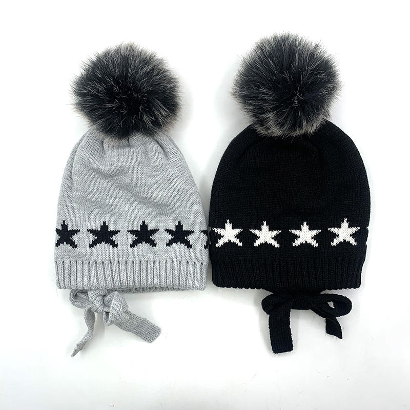 Unisex Embroidered Knitted Jacquard Beanie Hats Stars Dobby Fleece Lined Jacquard Baby Knitted Custom Kids Beanie Pompom Hats
