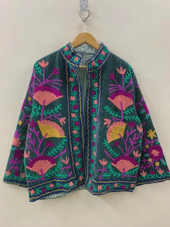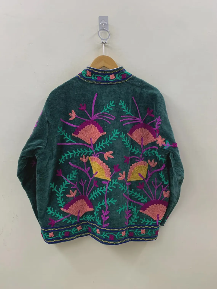 Unisex Handmade Suzani Embroidery Velvet Jacket Vintage Boho Floral Pattern Winter Coat Breathable Cotton Filling Knitted