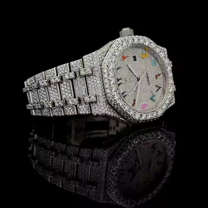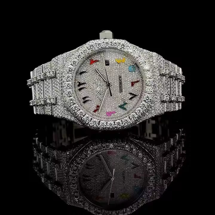 Unisex Luxury Automatic Moissanite VVS Watch Stainless Steel Band Arabic Numeral Dial Quartz Movement Hip Hop Style Antique Dial