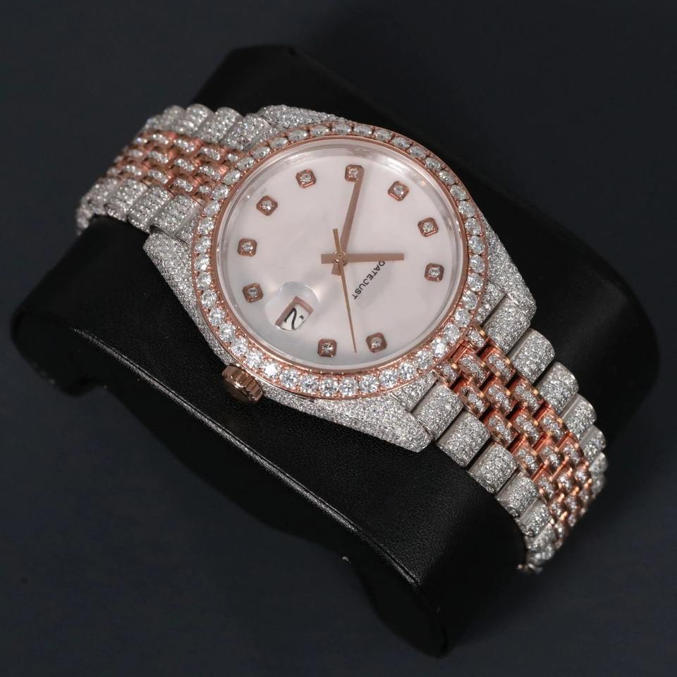 Unisex Luxury Moissanite Diamond Watch Stainless Steel and 18K Gold Two-Tone Plated Quartz Movement Fine Fashion Jewelry
