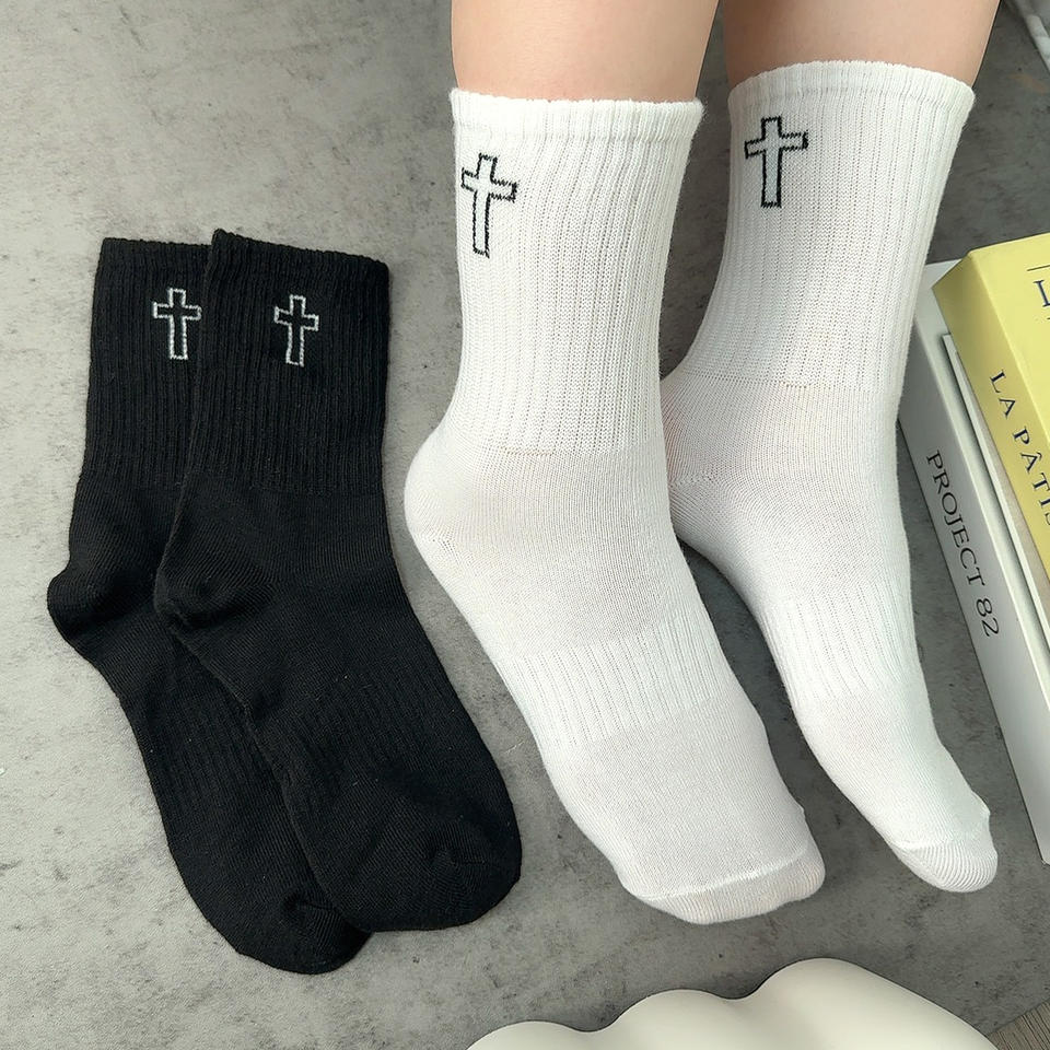 Unisex Men's Mid-Calf Casual Crew Socks High-Cut Solid Sports Breathable Knitted Socks in Black/White Cross Couple Design