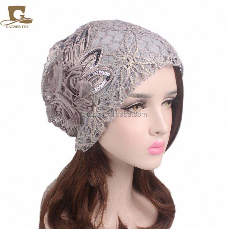 Unisex Metallic Lace Flower Head Cap Chemo Beanie Cancer Hat Head Wrap Turban Bonnet Cap Image Style Common Fabric TTM-23