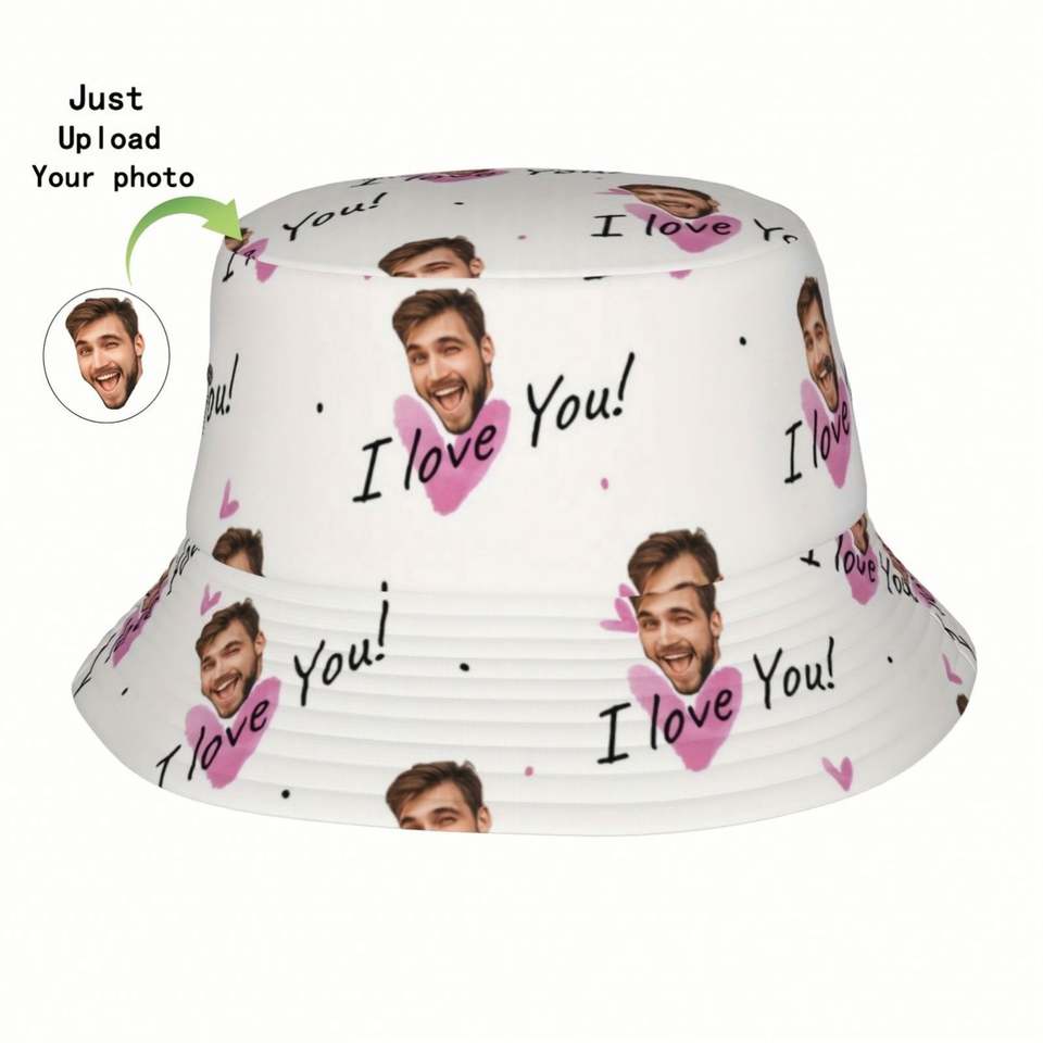 Unisex Polyester Bucket Hat Custom Photo 'I Love You' Cartoon Design Perfect Street Style Fisherman Cap for Men Birthday Gift