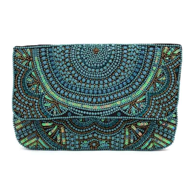 Colorful Sequined Woven Straw Clutch with Embroidered Banquet Envelope Canvas Lining Button Closure