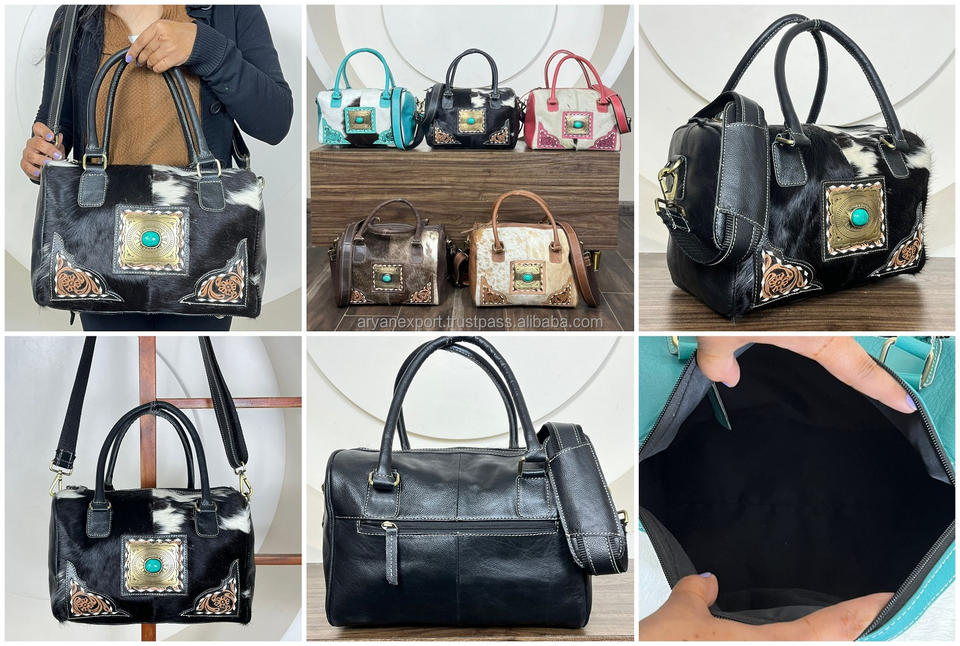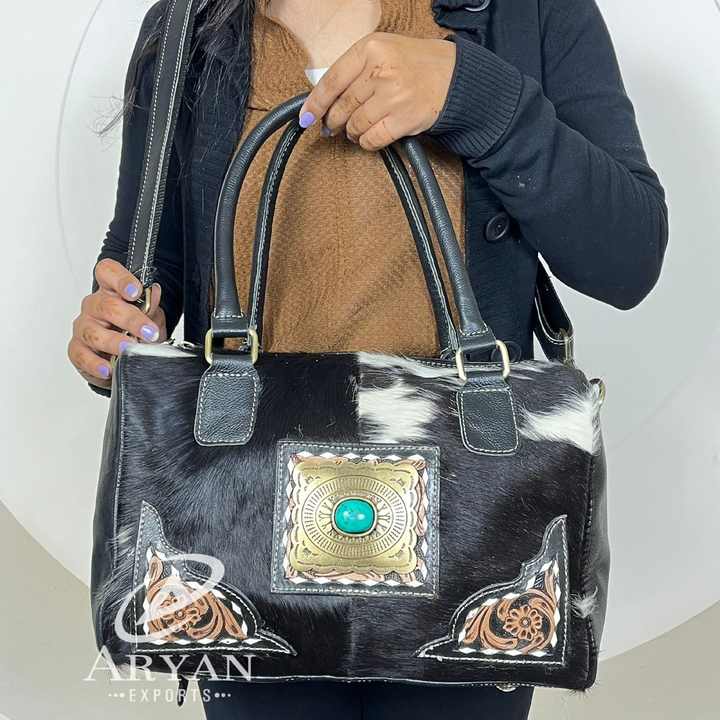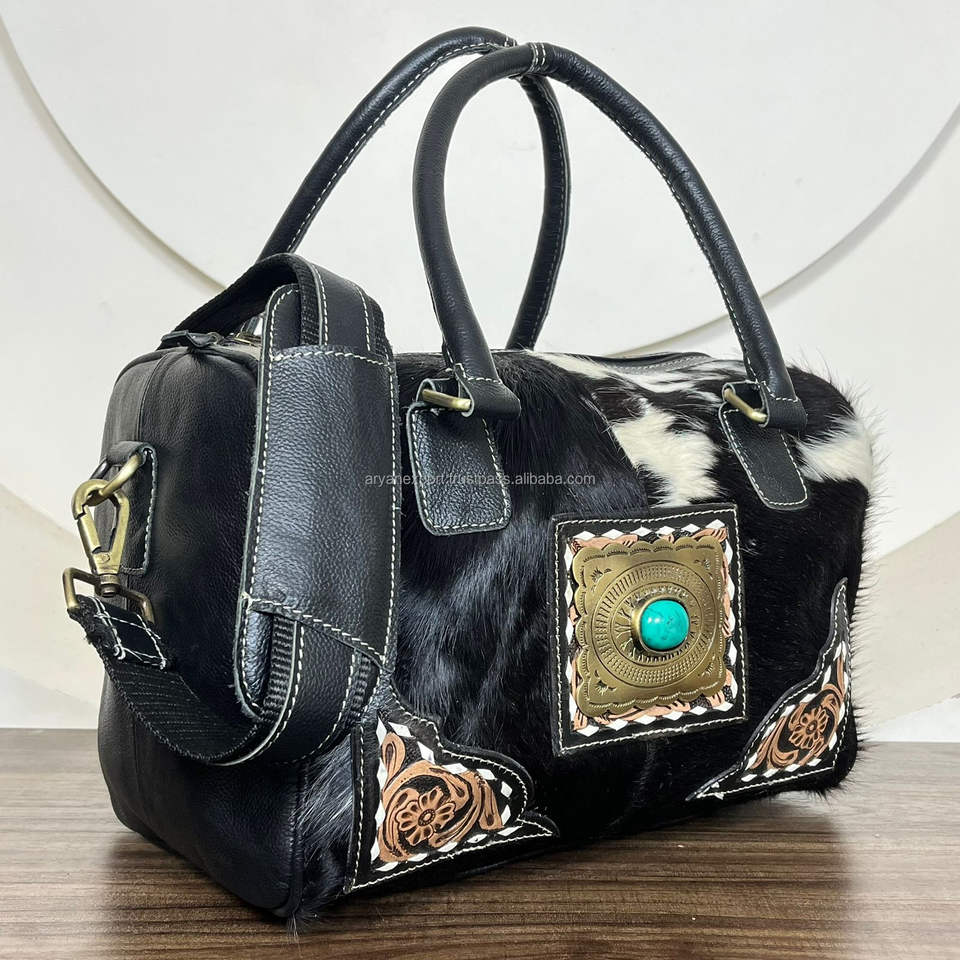 Unisex Portable Overnight Hand Tooled Leather Duffel Bag Genuine Hair On Cowhide Leather Turquoise Stone Small Travelling Bags