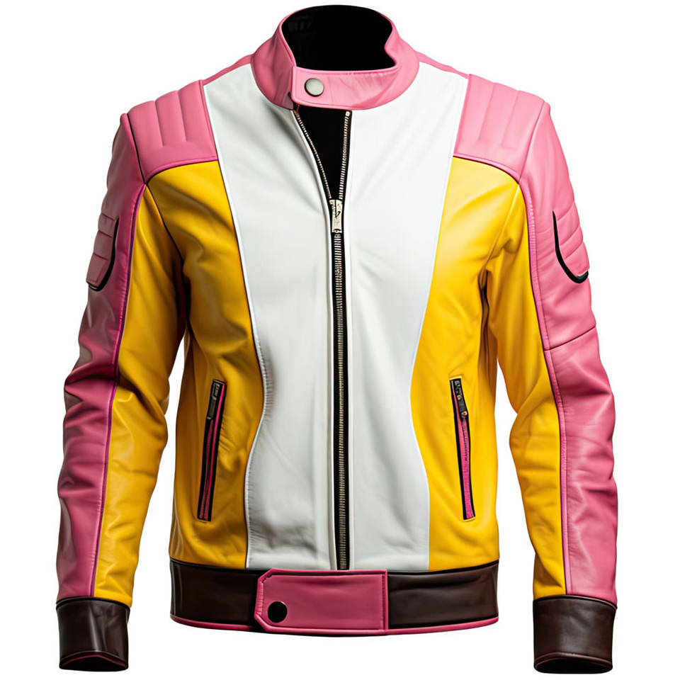 Unisex Retro Biker Varsity Jacket in Pink Yellow Casual Canvas Crocheted Pattern with Zipper Closure Winter Denim Fabric