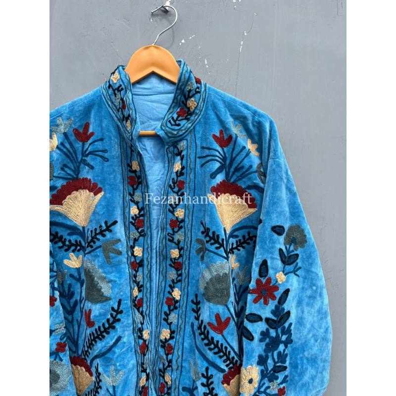 Unisex Short Cotton Velvet Quilted Winter Jacket Neon Blue Suzani Embroidery Autumn Knitted Quick Dry Women Boho Hippie Style