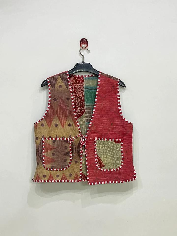 Unisex Sleeveless Cotton Kantha Jacket with Quilted Waistcoat Pockets Breathable Handmade Kantha Waistcoat for Women