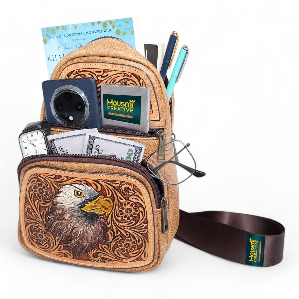 Unisex Stylish Western Vintage Cow Leather Crossbody Bag Custom Economical Eagle Face Tooling Men's Chest Pack Lady's Sling Pack