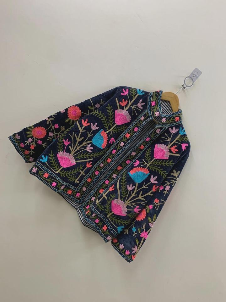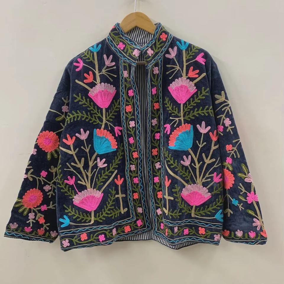 Unisex Vintage Boho Winter Jacket Suzani Embroidery Floral Velvet Chic Ethnic Outerwear with Cotton Filling Knitted Processed