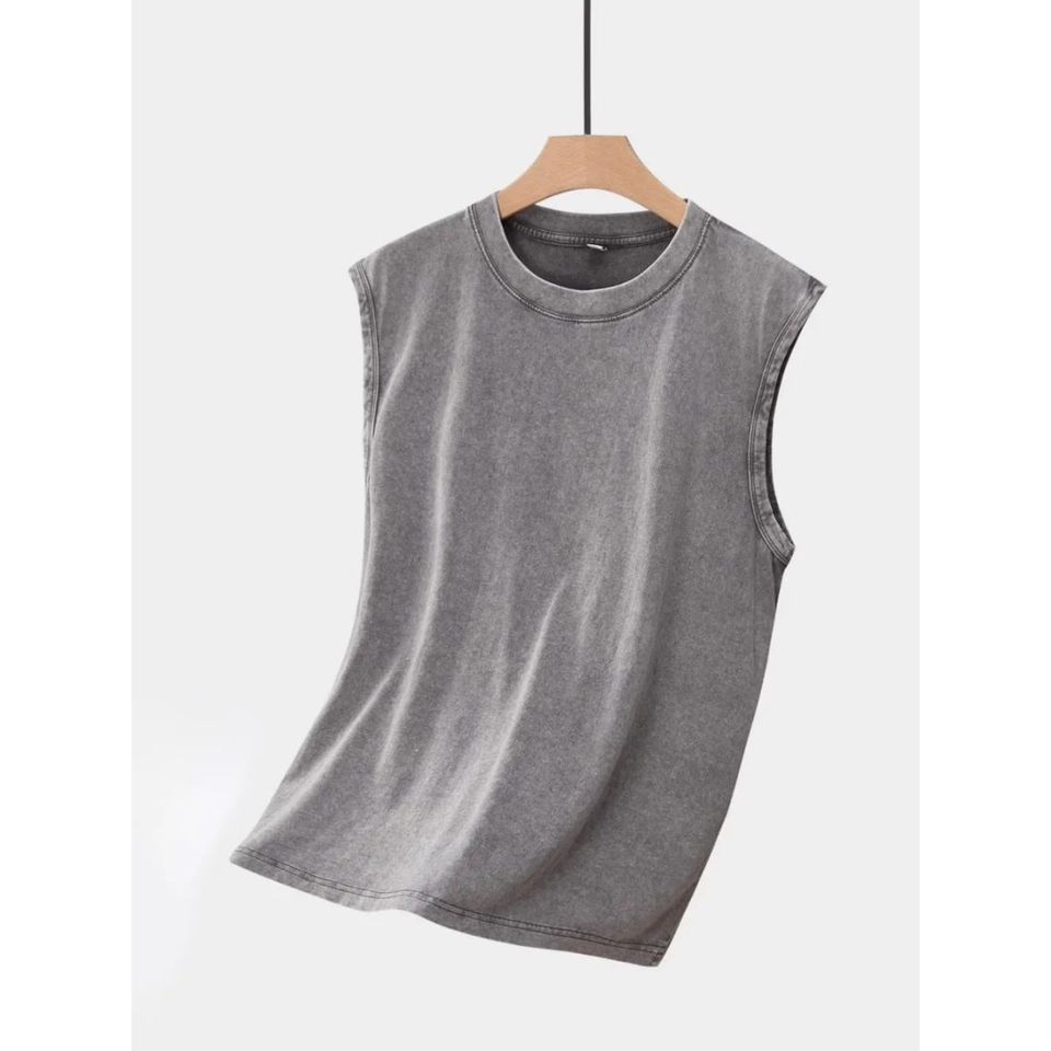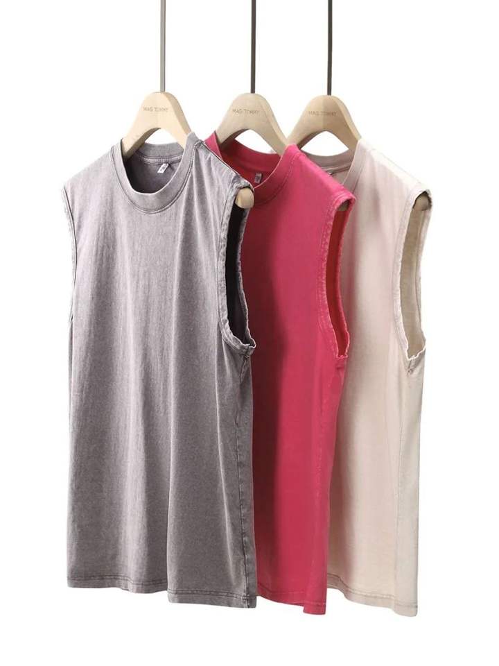 Unisex Vintage Cotton Vest Men's Sleeveless T-shirt Retro Old Shoulder Breathable Knitted Sporty Top Front Washed Heavy Loose
