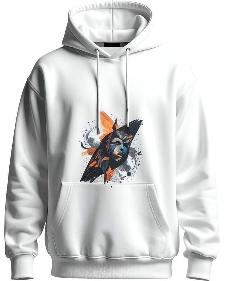 Unisex White Graphic Pullover Hoodie with Abstract Art Print Streetwear Style Fleece Sweatshirt Casual Winter Wear
