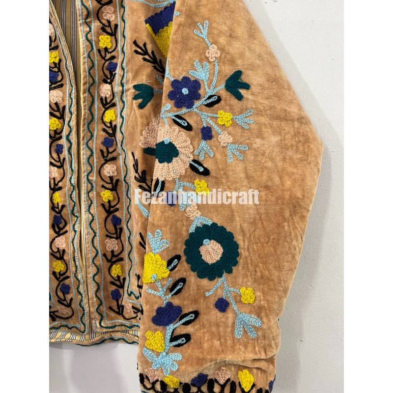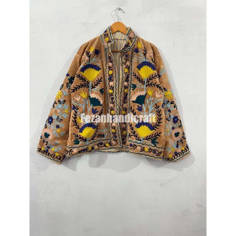 Unisex Winter Cotton Velvet Jacket Stand Collar Floral Embroidered Suzani Fabric Wholesale Uzbek Style Boho Hippie Short Autumn