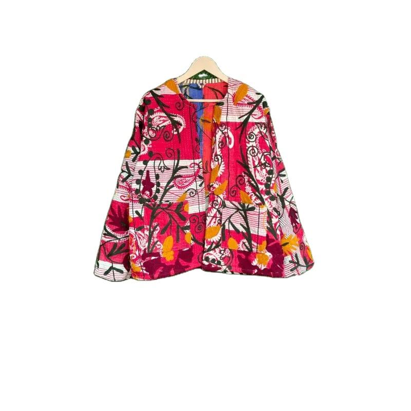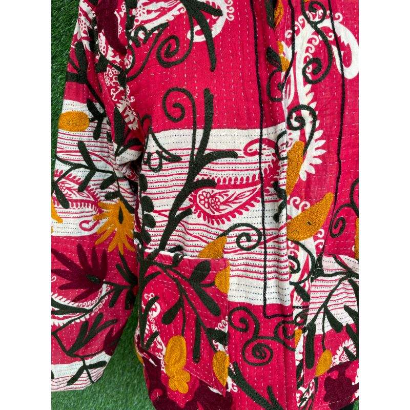 Unisex Winter Jacket Indian Cotton Kantha Quilt Suzani Hand Embroidered Design Denim Belt Quilted Coat-Wholesale Fabric Coats