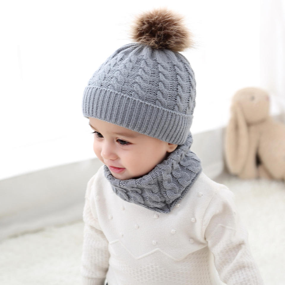 Unisex Winter Warm Fur Ball Hat Scarf Set for Kids Baby Beanie Cap Scarf with O Ring Digital Printing H048 for Boys Girls