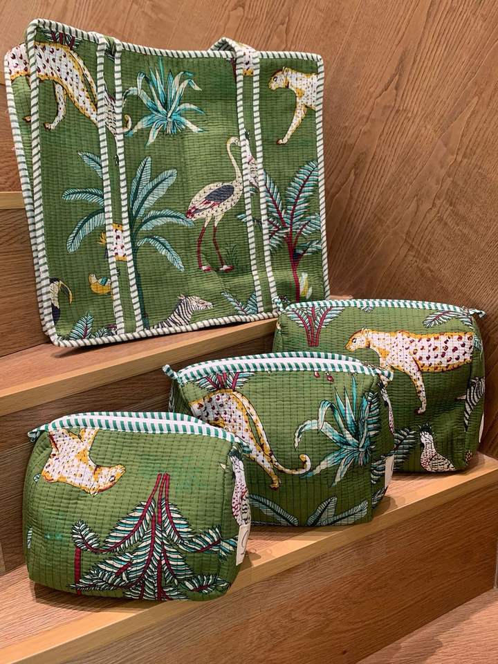 Unisex Zipper Closure Cotton Tote Bag Pouch Set 100% Handblock Printed Animal Print Cosmetic Bag Assorted Stylish Tote Bag Set