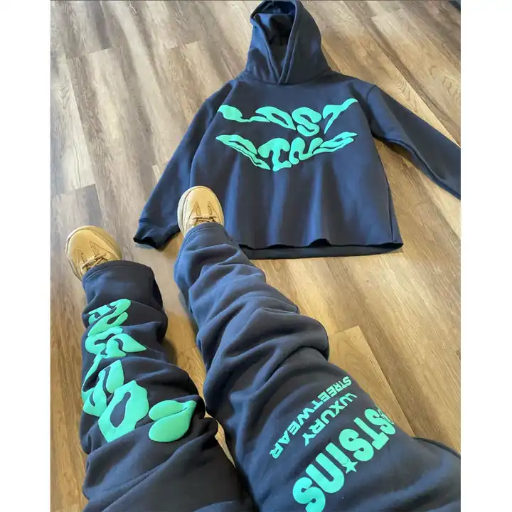 Unisex orange graphic printed hoodie and sweatpants tracksuit set heavy fleece winter warm casual streetwear