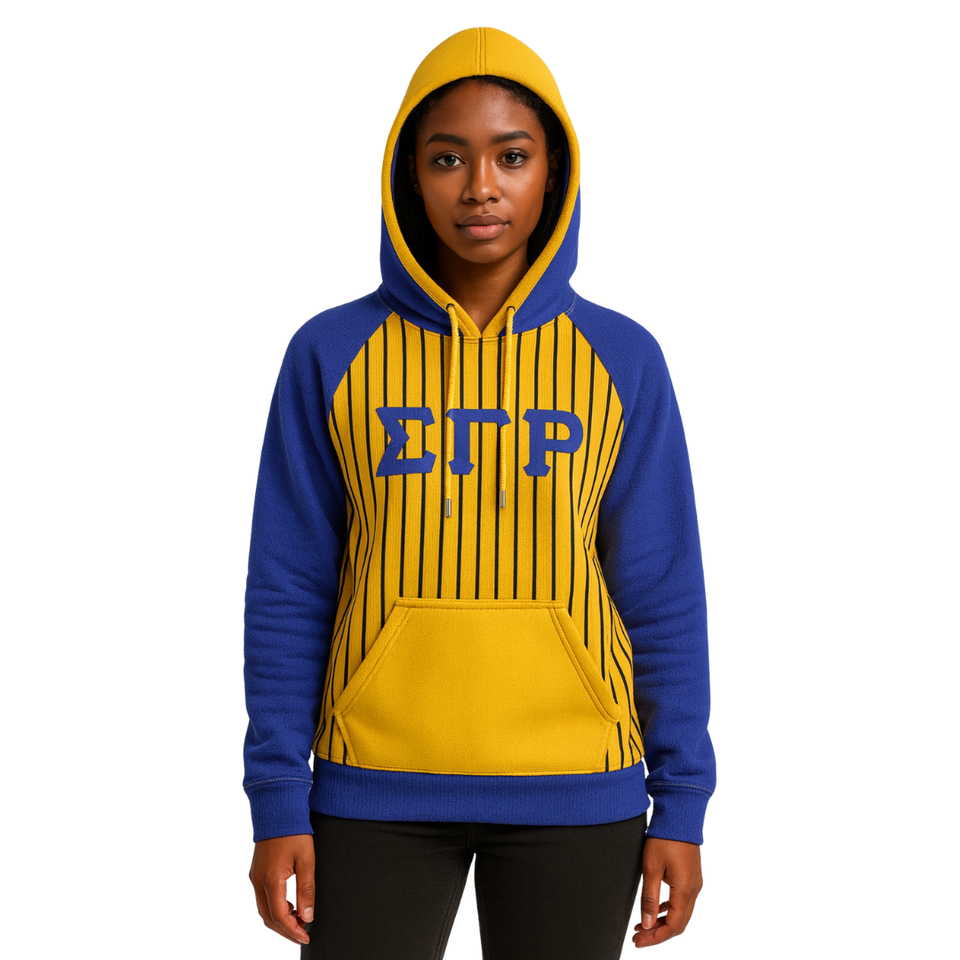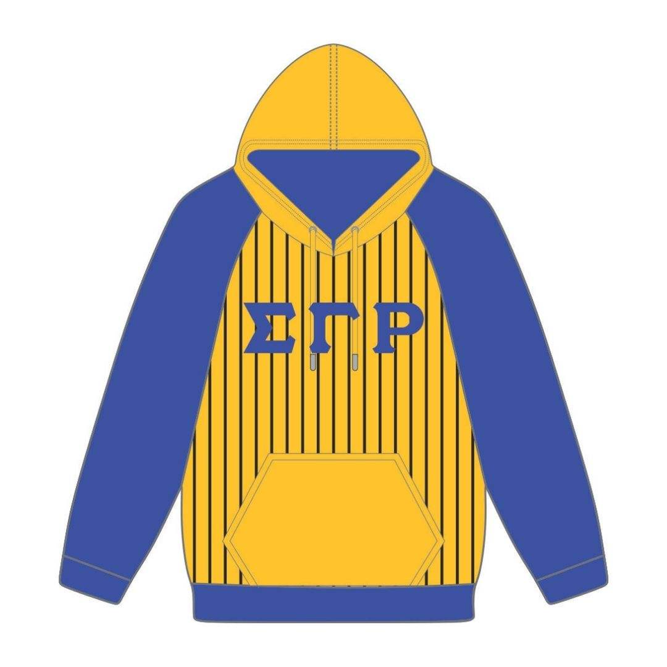 Unisex pullover hoodie blue yellow graphic panel fleece hooded sweatshirt greek letter print front pocket rib cuffs