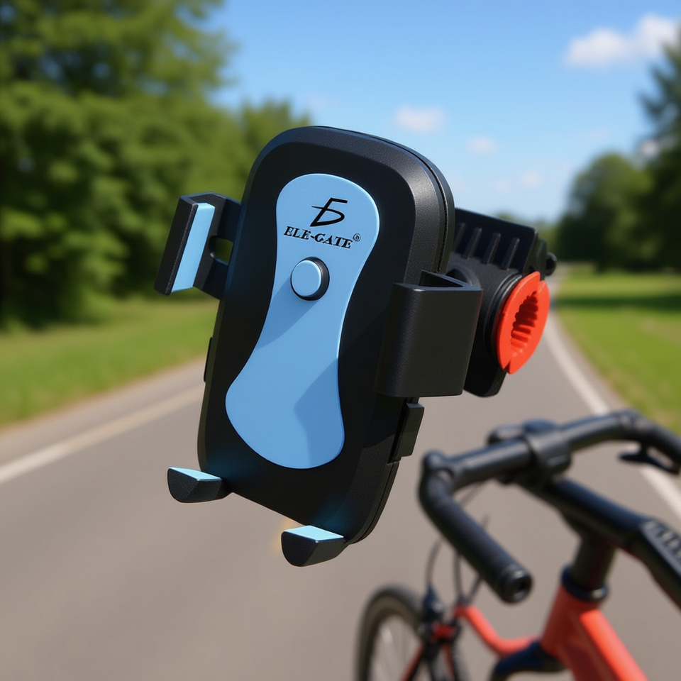 Universal Bicycle Cell Phone Holder by ELEGATE, ABS Material, Handlebar Mount, Adjustable Clamp, Black & Blue, Model HOLD.41, fo