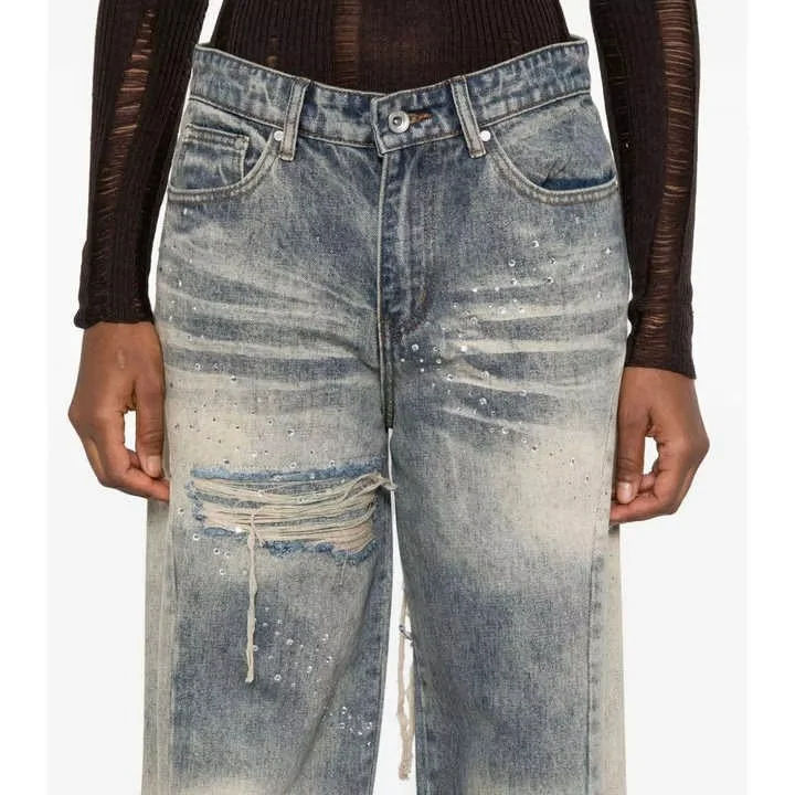 Unsex Casual Streetwear Flare Denim Jeans Distressed Embroidered Light Wash Winter Spring Trendy Unique Customized Design