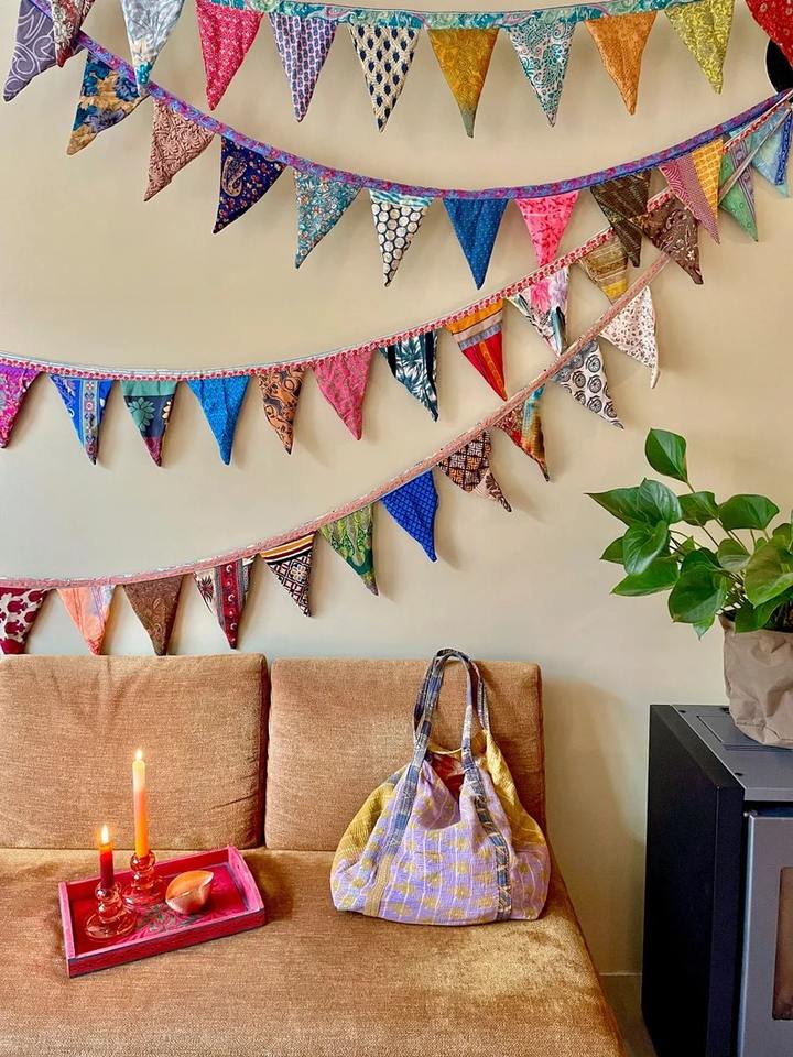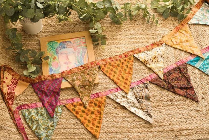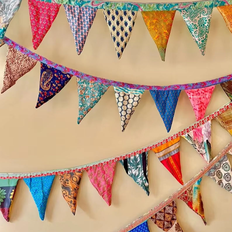 Up-cycled Sari Flags Bunting Bohemian Handmade Silk Waterproof Customizable Eco-Friendly Wall Decor for Parties Weddings Dorms