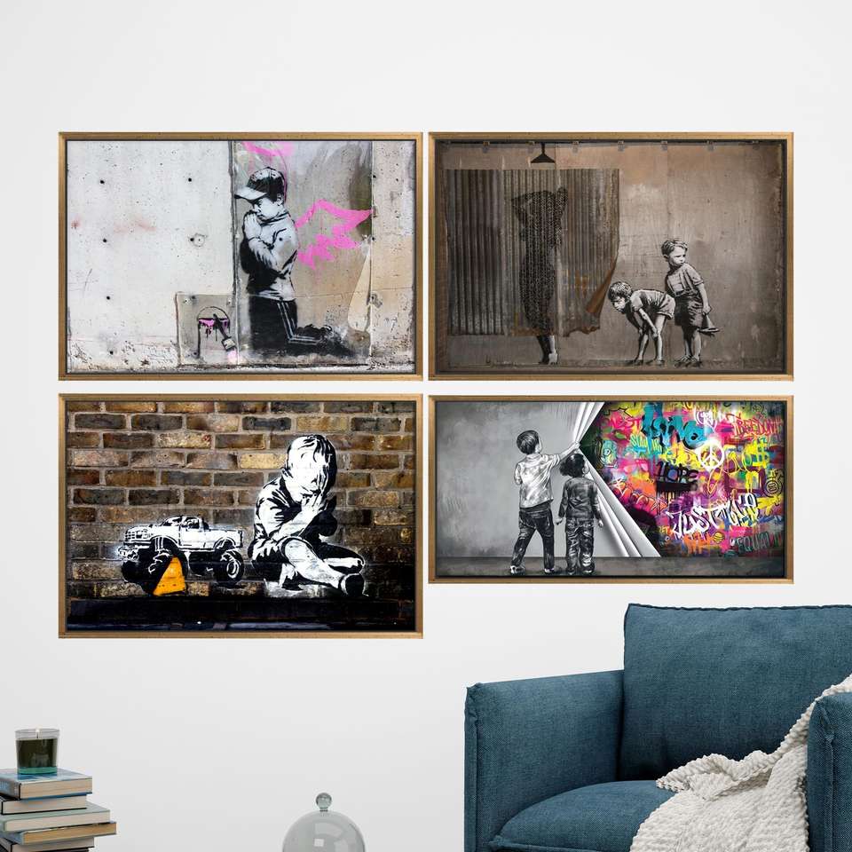 Urban Street Art Canvas Print Banksy Inspired Graffiti Artwork,Set of 4 Gold Framed