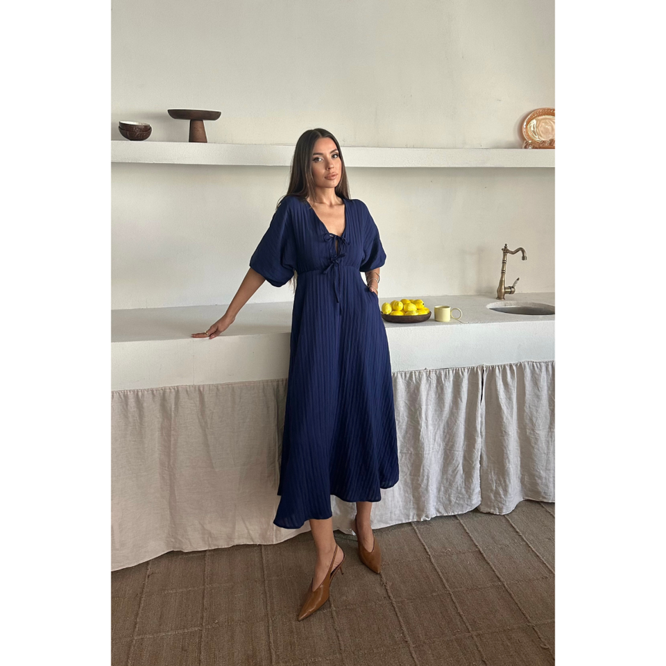 V-Neck Draped Navy Blue Dress Hollow Ruffles Decoration Plus-Size Formal Party Club Style Modest Sweet Solid Pattern Free Size