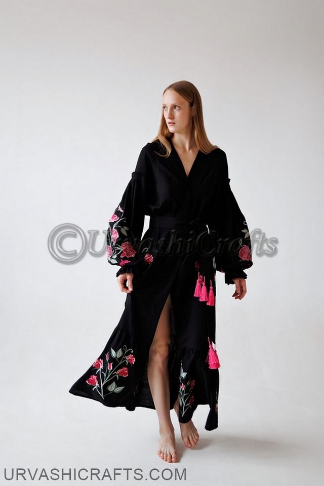 Name:Maxi black roses pattern linen buttoned embroidered dress